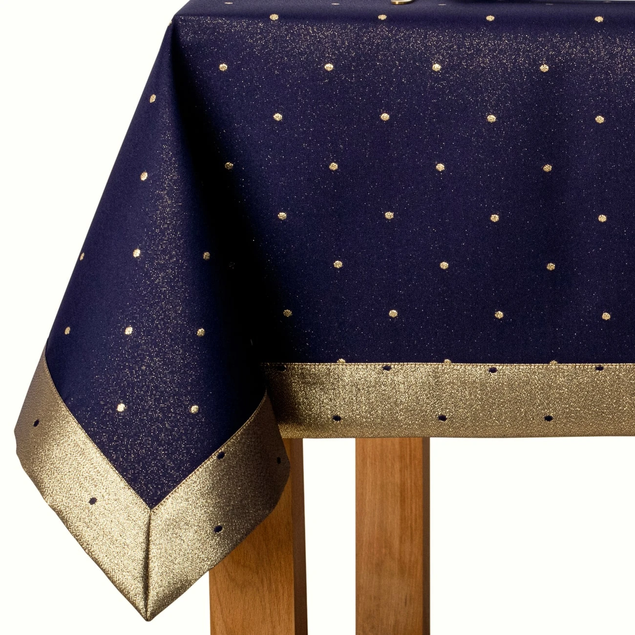 - dzięki specjalnemu splotowi żakardowemu, obrusy można stosować dwustronnie - jedna strona to przewaga koloru granatowego z kropkami w kolorze złotym natomiast druga strona to dominacja koloru złotego wraz z kropkami w kolorze granatowym,